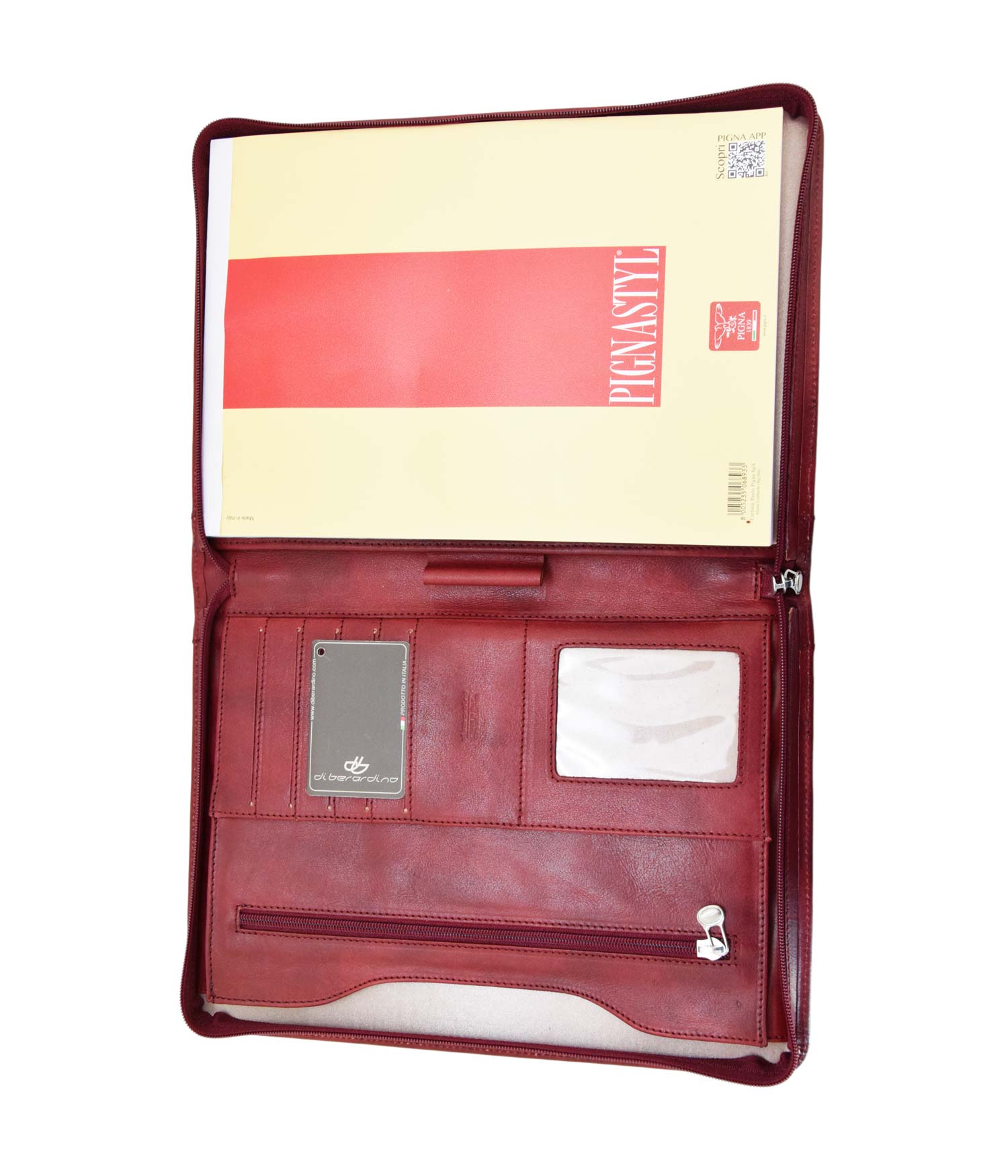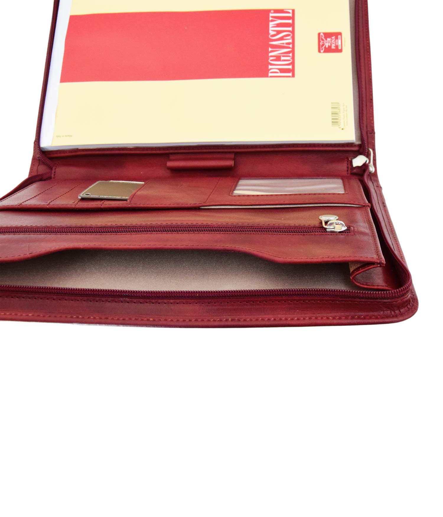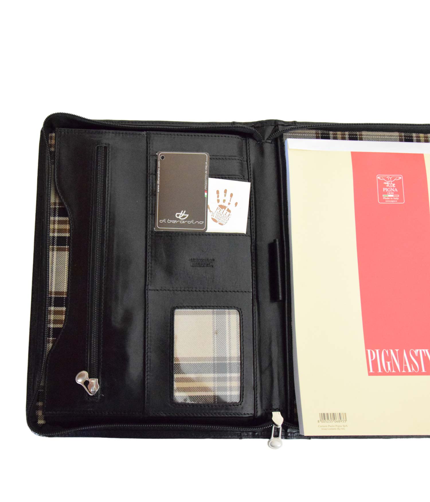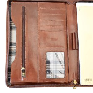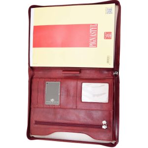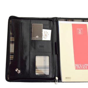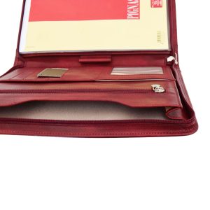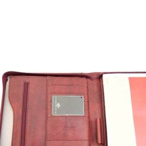L’apertura con zip rivela un interno funzionale, con a destra una tasca per un blocco note A4 e sulla sinistra tasche multiple dove riporre in modo organizzato biglietti da visita, tessere e credir-cards oppure oggetti e fogli. Ideale, durante conferenze o riunioni, per prendere appunti e conservare documenti.