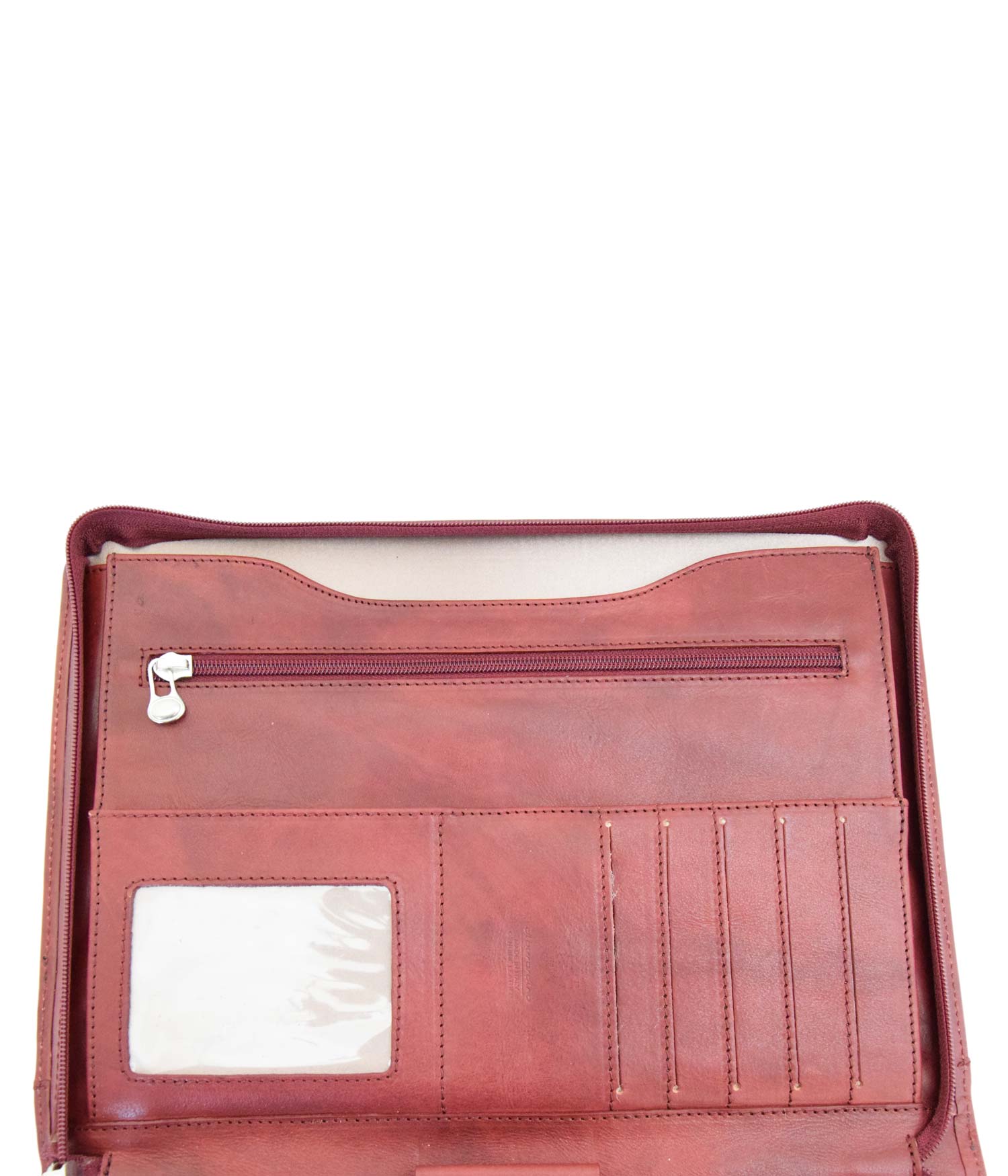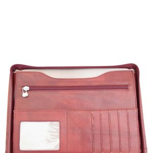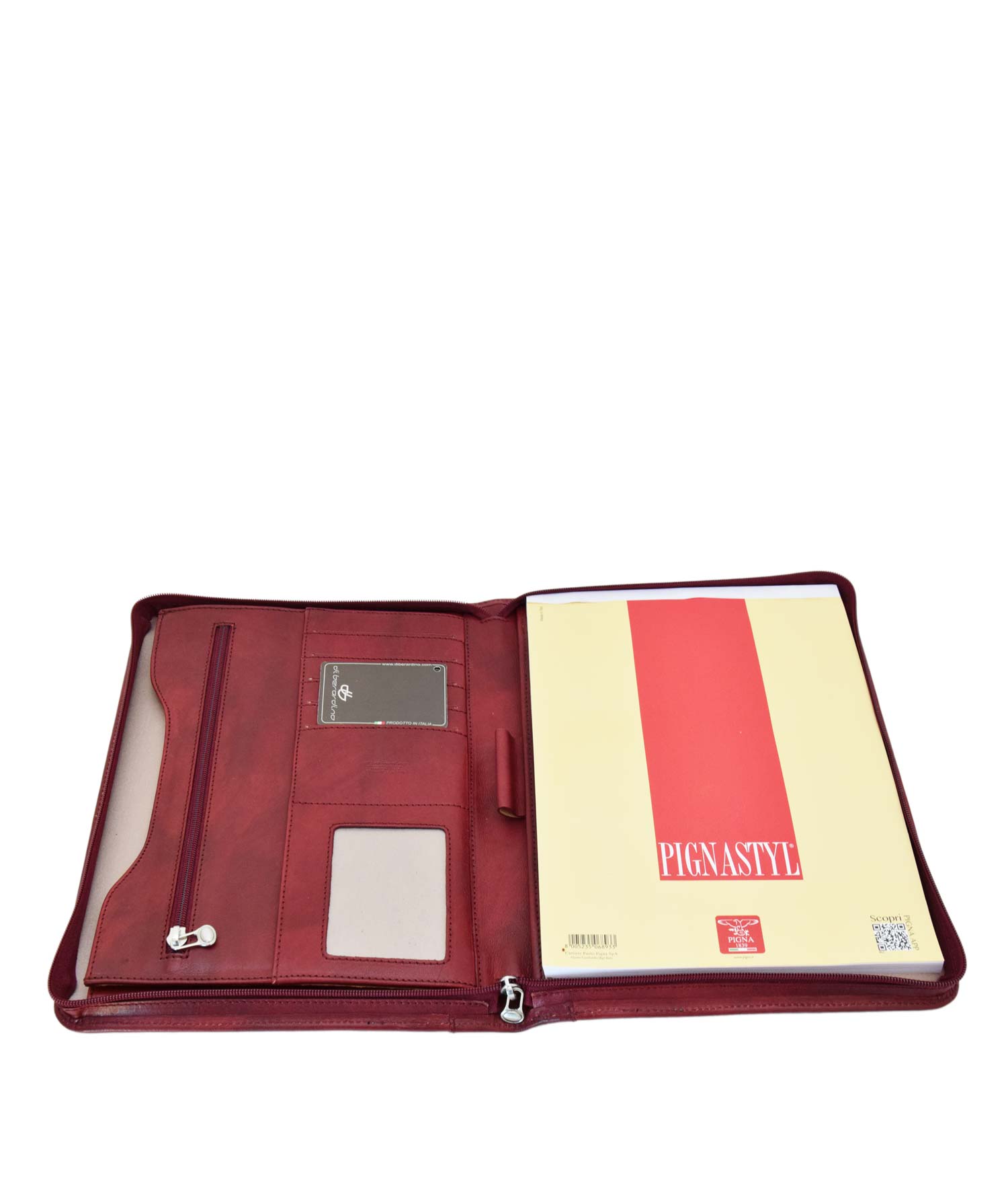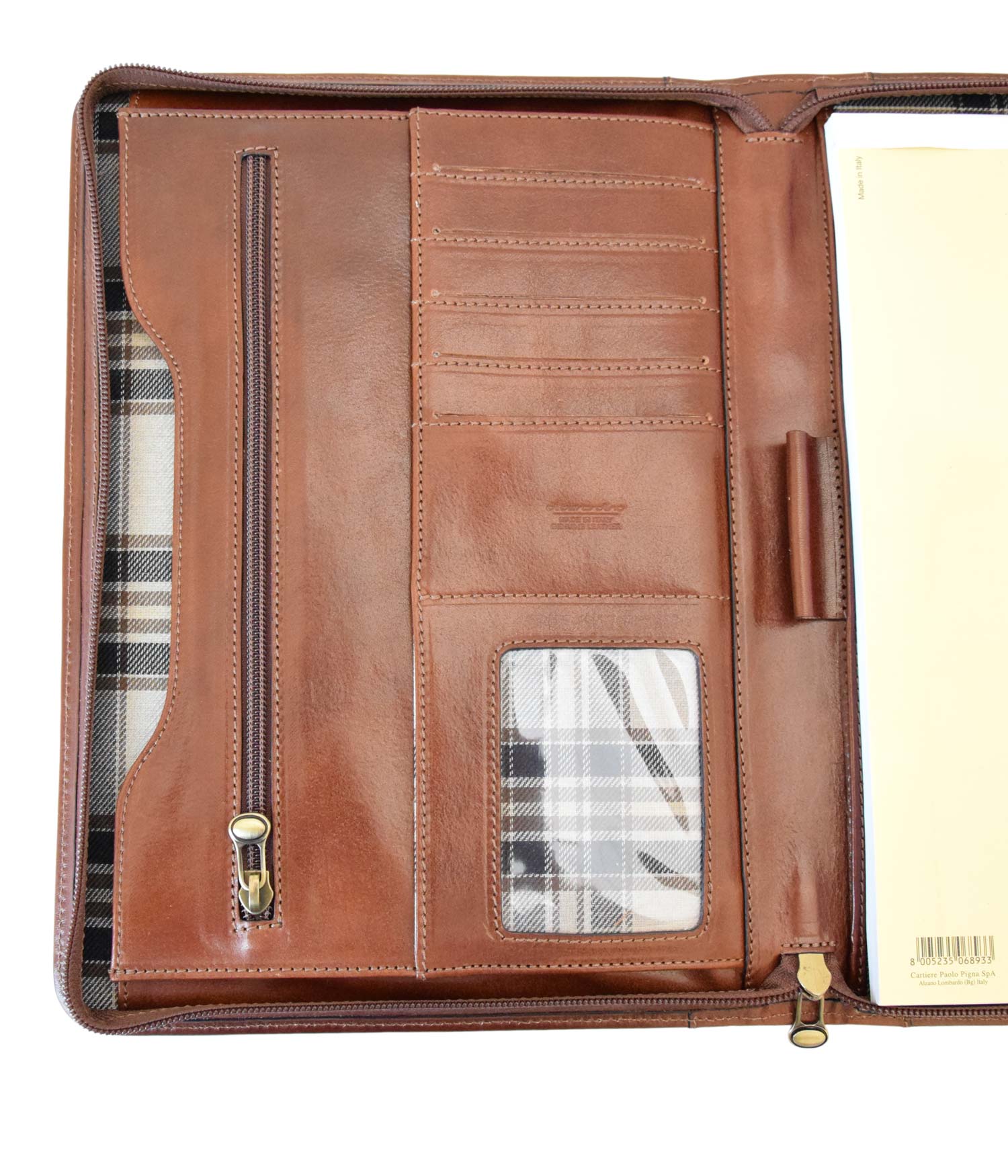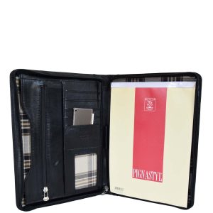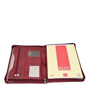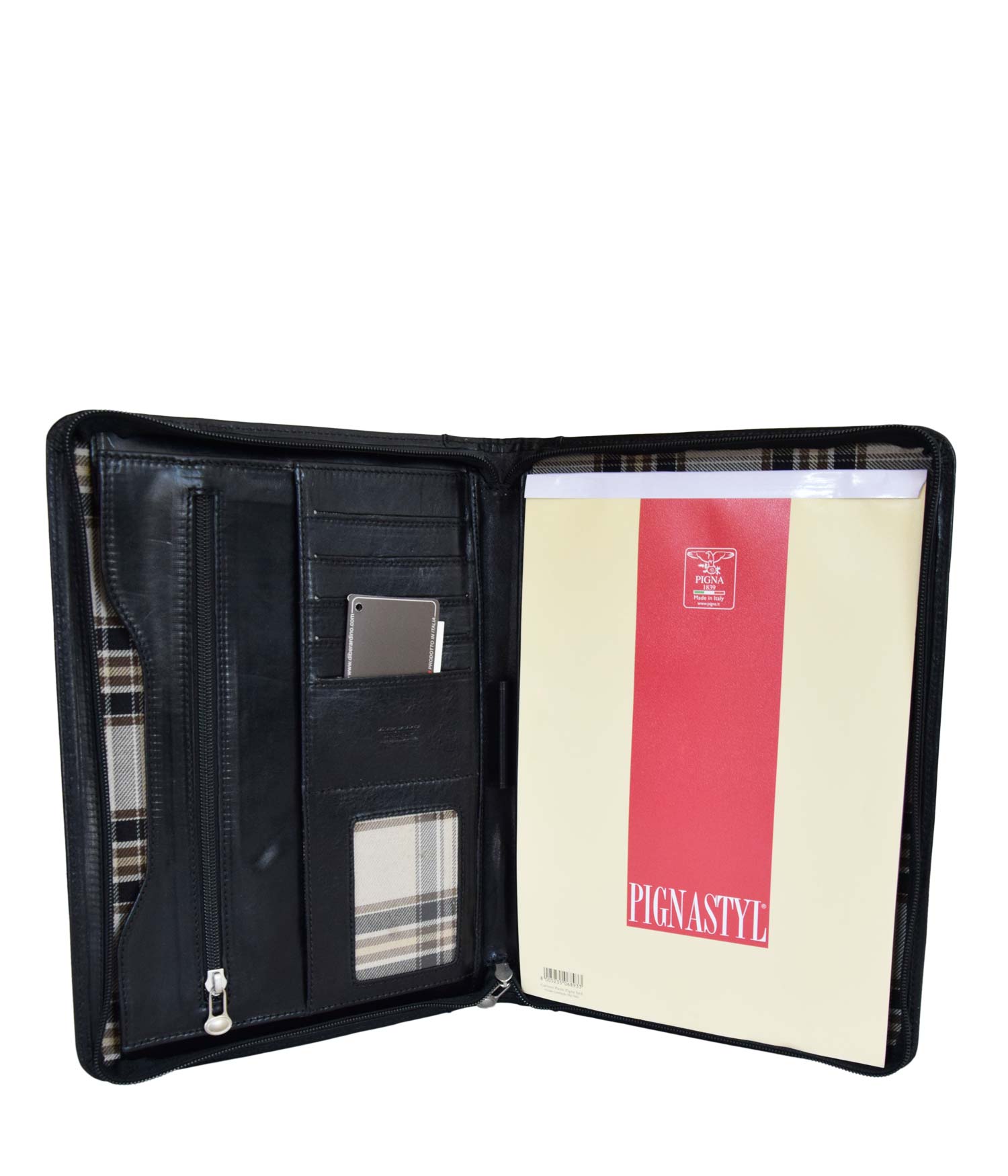 L’apertura con zip rivela un interno funzionale, con a destra una tasca per un blocco note A4 e sulla sinistra tasche multiple dove riporre in modo organizzato biglietti da visita, tessere e credir-cards oppure oggetti e fogli. Ideale, durante conferenze o riunioni, per prendere appunti e conservare documenti.
