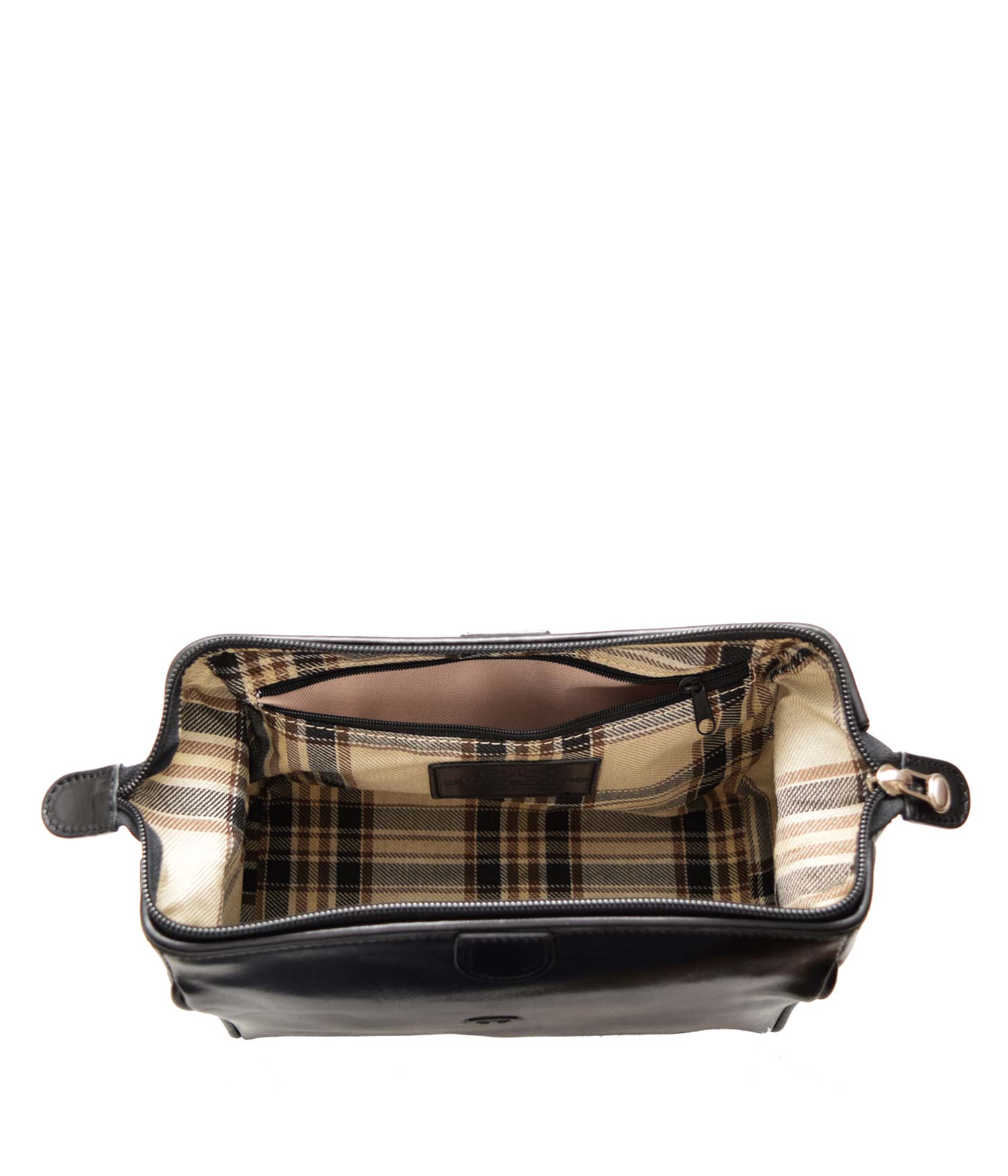 La chiusura a zip si apre per rivelare un ampio vano, rivestito con un morbido tessuto di cotone, con una piccola tasca con zip nella parte posteriore.